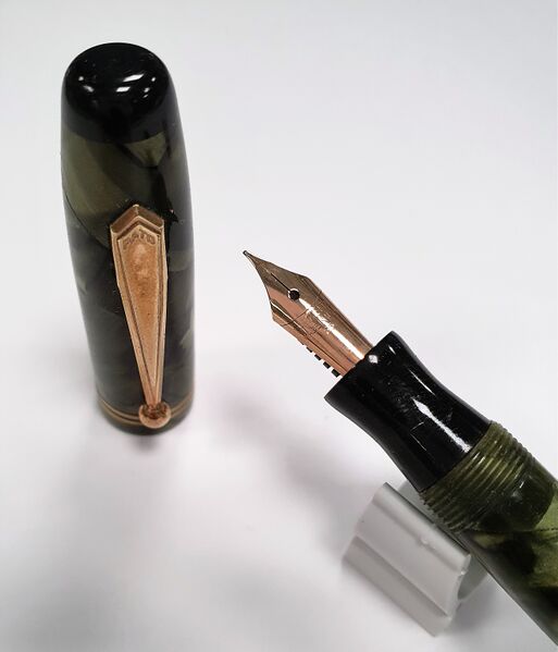 Photo of a pen produced by Parker. Model: Parkette. Filling system: lever filler. In marbled green celluloid. Type 3b, made in USA, golden steel nib No. 25.