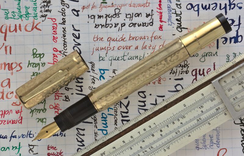 Photo of a pen produced by Invicta. Filling system: safety. With alternating smooth and arabesque faceted gold rolled overlay. Non-original nib, rolled gold "18 K.R." and brand marking on the knob.