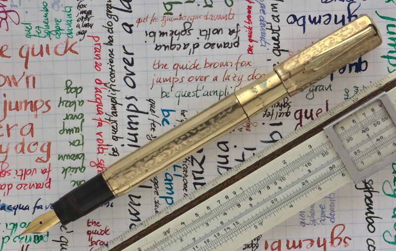 Photo of a pen produced by Invicta. Filling system: safety. With alternating smooth and arabesque faceted gold rolled overlay. Non-original nib, rolled gold "18 K.R." and brand marking on the knob.