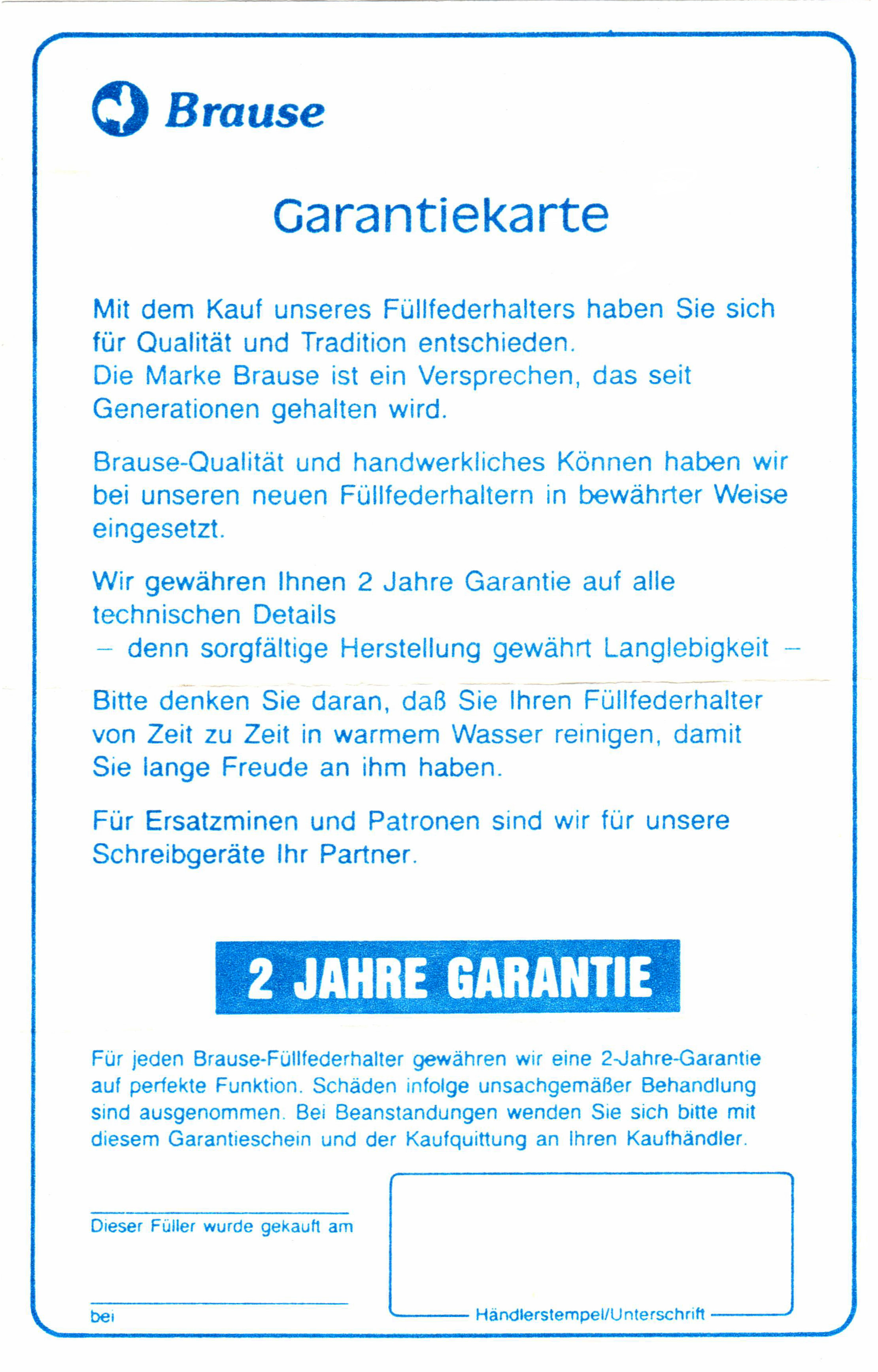 Scansione di un foglietto di istruzioni Brause degli anni '60. Garanzia. Datazione incerta. Foglio singolo. Contributo di David Parisi (utente forum pencilator). Da una confezione originale.