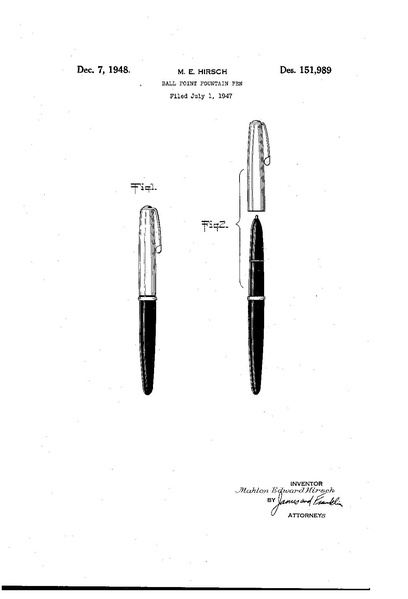 Brevetto di design per una penna a sfera. Riferimenti a nº US-D130356 e nº US-D140151.