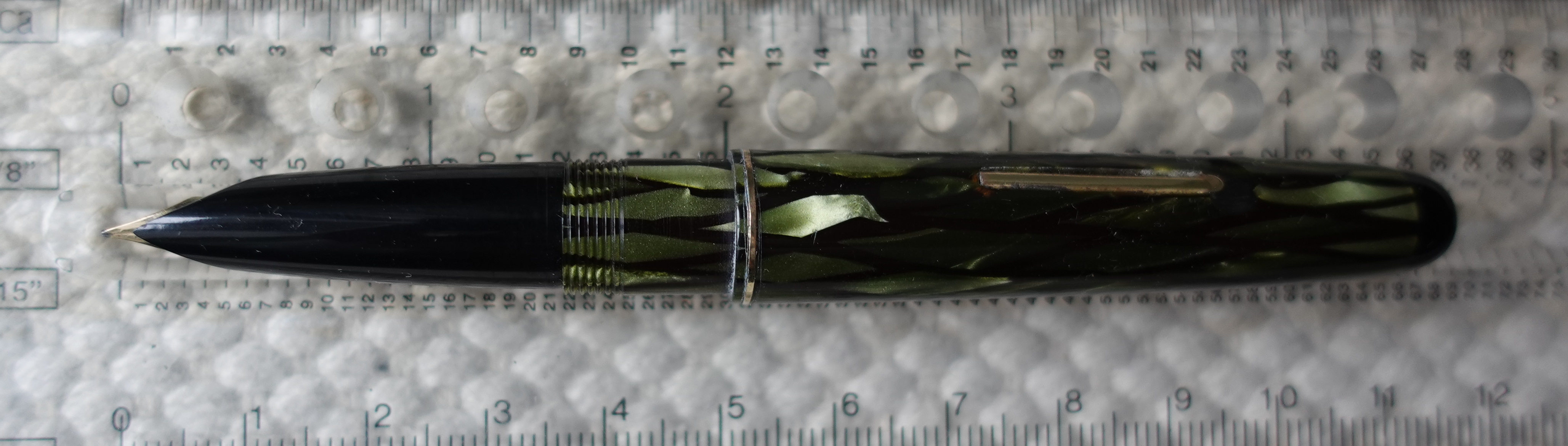 Photo of a pen produced by Contessa. Filling system: lever filler. In line crossed green celluloid. Unknown model with hooded nib.