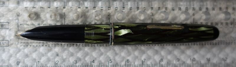 Foto di una penna Contessa. Caricamento a levetta. Realizzazione in celluloide verde a righe incrociate. Modello ignoto a pennino coperto. Contributo di Andrea (utente forum bisguillo).
