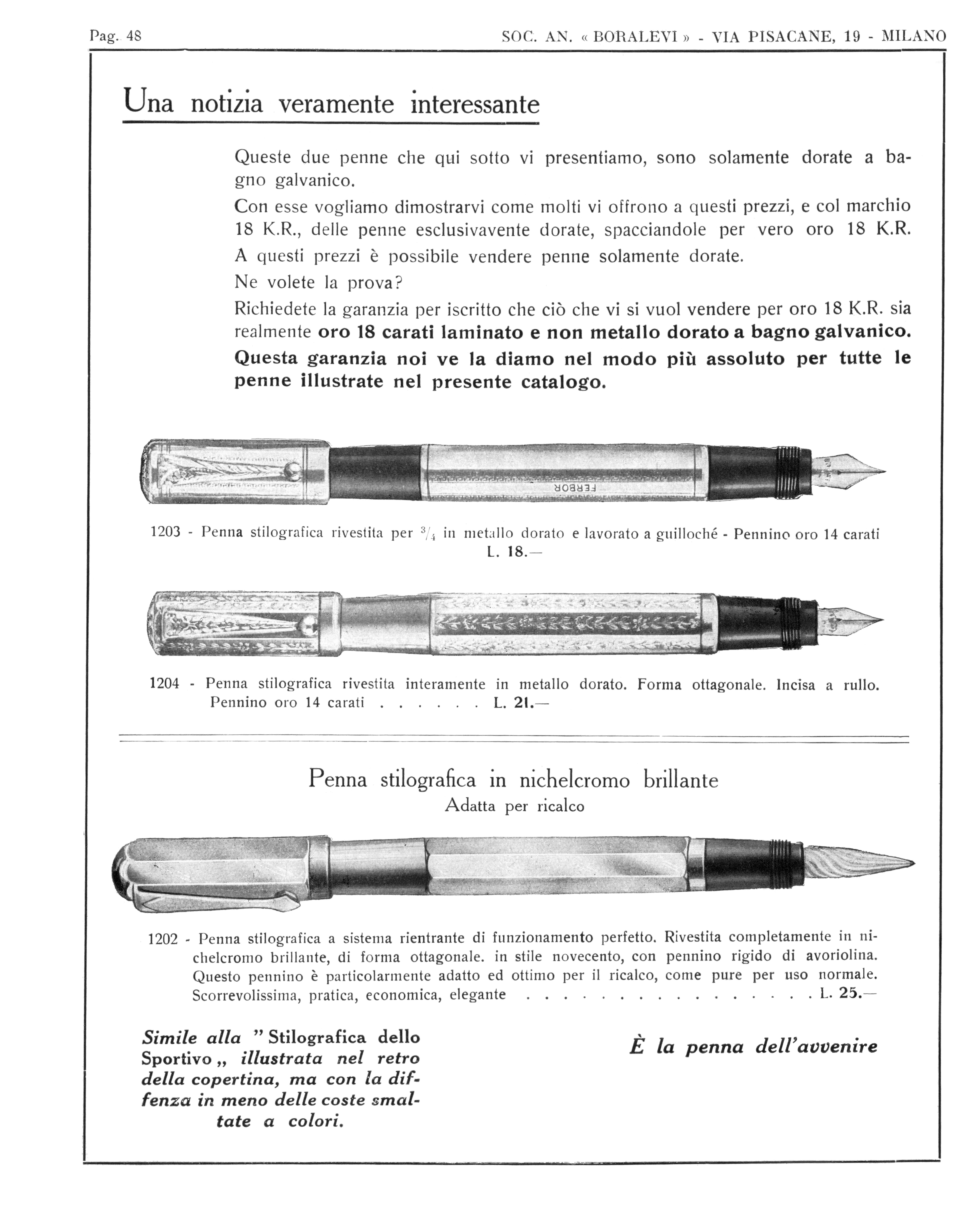 Scanning of a catalog page from Boralevi dated 1933-11. Retouched by the author for a better sharpness. Date reported on another page. Catalog 1934.XII, N. 26, November 1933. Fourty-eighth page. Advertising some safety (not laminated but in gilded metal) of which one marked Ferbor and one with a spiral nib for tracing (in avoriolin).