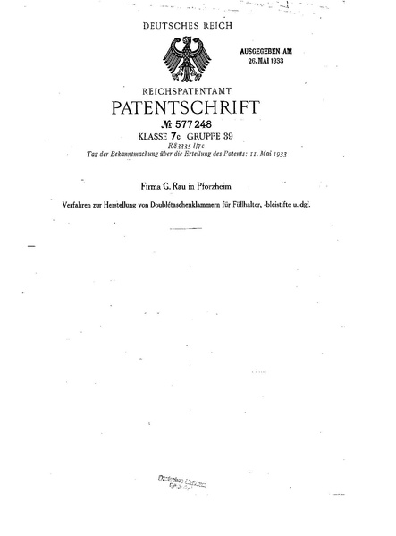 | attuale | 19:56, 11 ago 2017 | 1 295 × 1 752, 3 pagine (123 KB) | Piccardi (discussione | contributi) | {{PatentInfo |Inventor=Firme G. Rau |Assignee=Firme G. Rau |Country=DE |ApplicationNum=R83335 |ApplicationDate=1931-11-20 |PatentNum=577248 |PatentDate=1933-05-26 |PriorityDate=1931-11-20 |Titolo=Verfahren zur Herstellung von Doubletaschenklammern fuer... |
