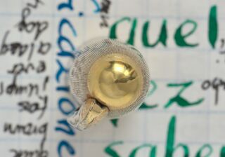 Foto di una penna Soffer. Caricamento a stantuffo. Realizzazione in celluloide trasparente a righe verdi. Dettaglio della testa del cappuccio. Modello ignoto a pennino coperto con cappuccio laminato oro.