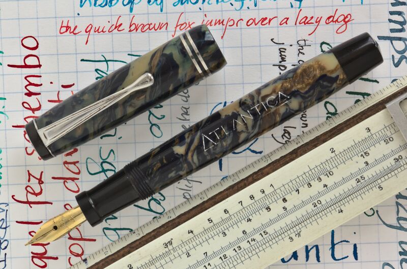 Foto di una penna Atlantica. Realizzazione in celluloide marmorizzata crema, verde e bronzo. Modello ignoto in stile flat-top con due verette.