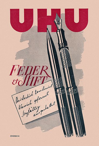 <multilang> @it|Scansione di una pubblicità del 1949 della Uhu per una combinazione penna/matita meccanica. Ritoccata dall'autore per una maggiore nitidezza. Datazione fornita dal venditore. @en|Scanning of a 1949 Uhu advertising for pen/pencil set. Retouched by the author for a better sharpness. Dating provided by seller. </multilang>