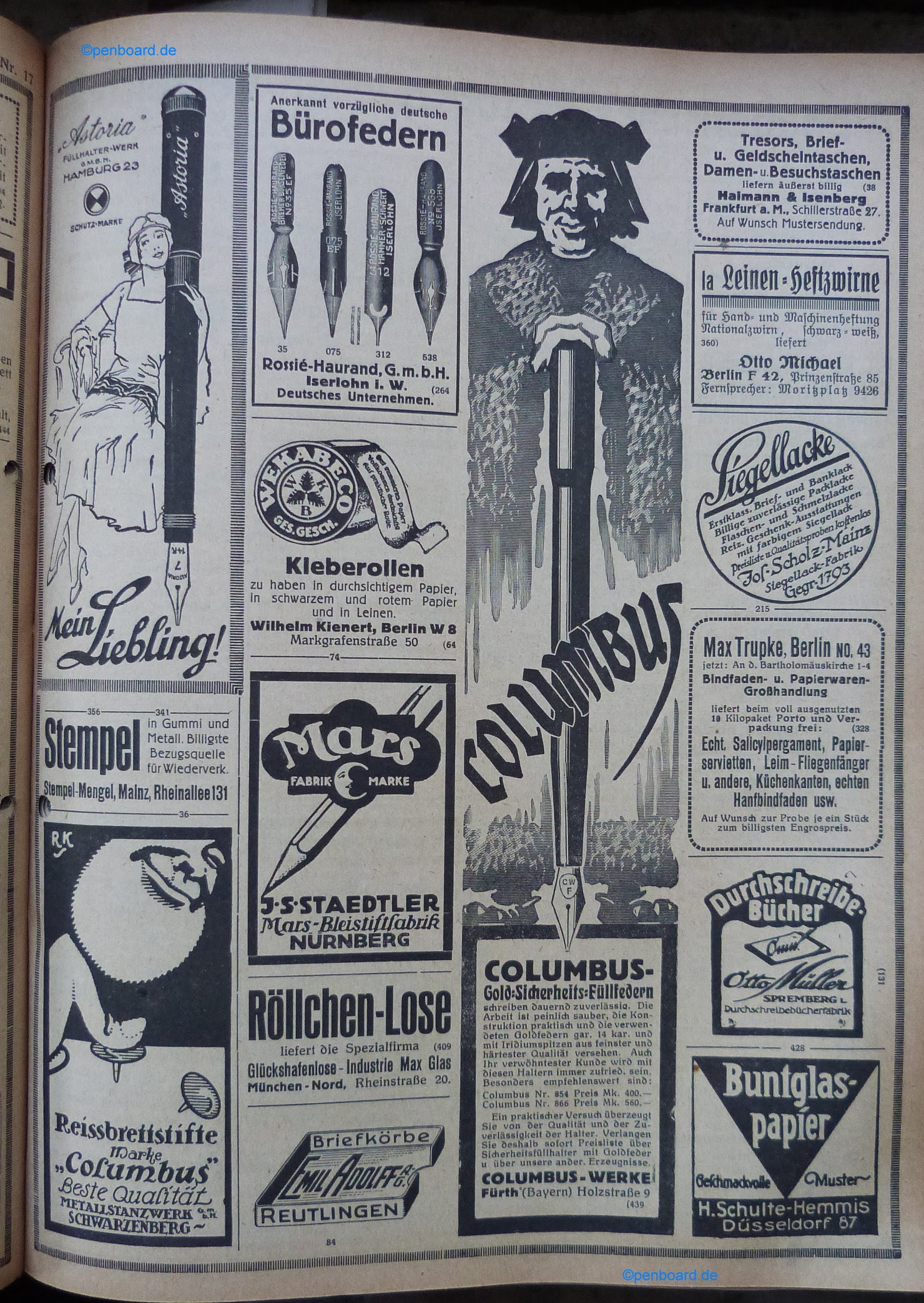 Scansione di una pubblicità datata 1922. Pubblicazione su: Papierhändler. Contributo di Tom Westerich, https://www.penboard.de. Data ottenuta da quella di pubblicazione del volume da cui la pagina è estratta. Pagina di pubblicità varie per articoli di cancelleria (fra cui le matite Mars della Staedtler) con due riquadri concernenti penne stilografiche, una pubblicità Astoria per una rientrante Astoria No. 7 ed una pubblicità Columbus-Werke che mostra un modello a caduta e che cita due modelli, Columbus Nr. 854 e Columbus Nr. 866.