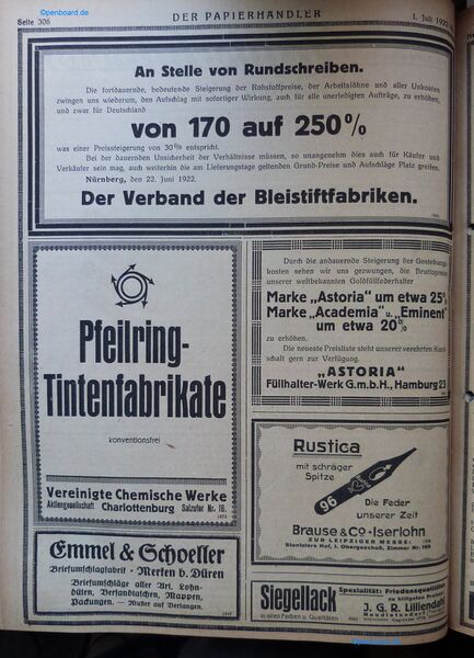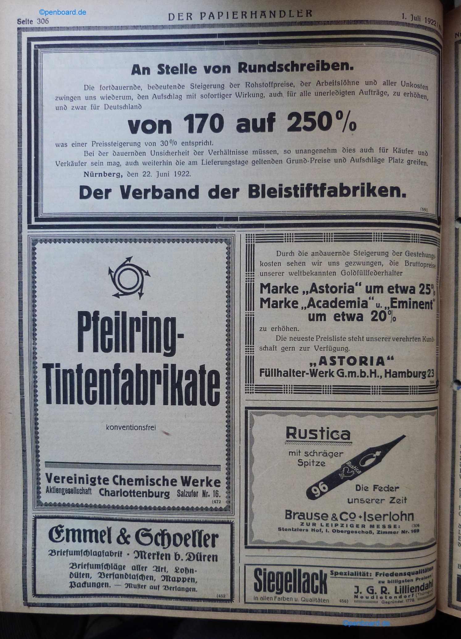 Scansione di una pubblicità datata 1922-07-01. Pubblicazione su: Der Papierhändler - Fachblatt Schreibwaren für Papier u. Büro-Bedarf, n. 26, pag. 306. Contributo di Tom Westerich, https://www.penboard.de. Data visibile direttamente. Pagina di pubblicità varie per articoli di cancelleria (riporta anche un pennino Brause) con un riquadro concernente penne stilografiche, con una pubblicità Astoria generica.