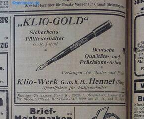 Scansione di una pubblicità datata 1922. Pubblicazione su: Der Papierhändler - Fachblatt Schreibwaren für Papier u. Büro-Bedarf. Contributo di Tom Westerich, https://www.penboard.de. Data ottenuta da quella di pubblicazione del volume da cui la pagina è estratta. Pagina di pubblicità varie per articoli di cancelleria con un riquadro concernente penne stilografiche, una pubblicità Klio-Werk per il modello Klio Gold.