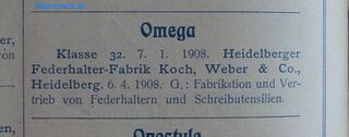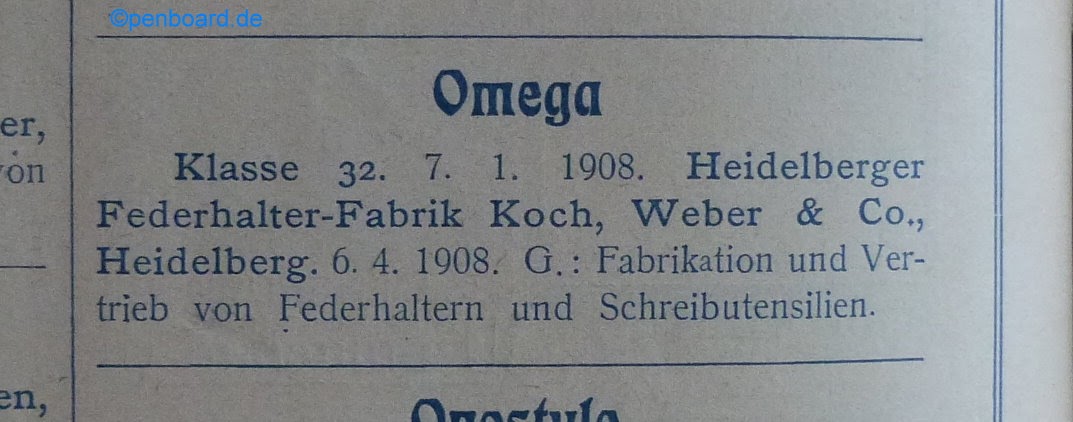 Scansione di una notizia datata 1908-04. Pubblicazione su: Der Papierhändler - Fachblatt Schreibwaren für Papier u. Büro-Bedarf. Contributo di Tom Westerich, https://www.penboard.de. Data visibile direttamente. Mese indicativo, usabile solo come limite inferiore. Indicazione della registrazione del marchio Omega da parte dalla Heidelberger-Federhalterfabrik Koch, Weber & Co. di Heidelberg (la Kaweco) per penne e utensili di scrittura. Riporta come dati del marchio: "Klasse 32" e le date 1908-01-07 (richiesta?) e 1908-04-06 (registrazione?).