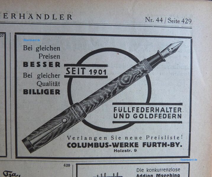 Scansione di una pubblicità datata 1932-10-29. Pubblicazione su: Der Papierhändler - Fachblatt Schreibwaren für Papier u. Büro-Bedarf, n. 44, pag. 429. Contributo di Tom Westerich, https://www.penboard.de. Data ottenuta da quella di pubblicazione del volume da cui la pagina è estratta. Mese e giorno determinati dal numero della rivista. Pubblicità della Columbus-Werke per un modello flat-top in stile Duofold. Riporta il 1901 come anno di nascita della ditta.