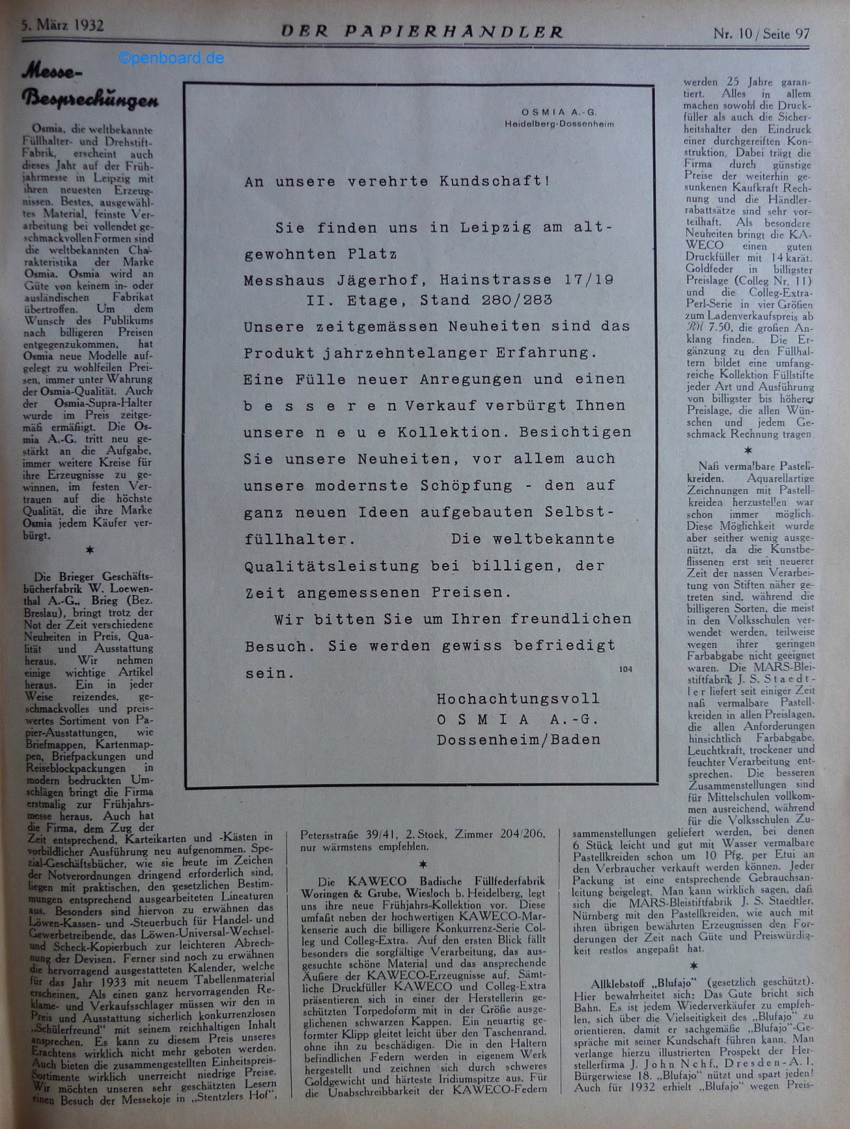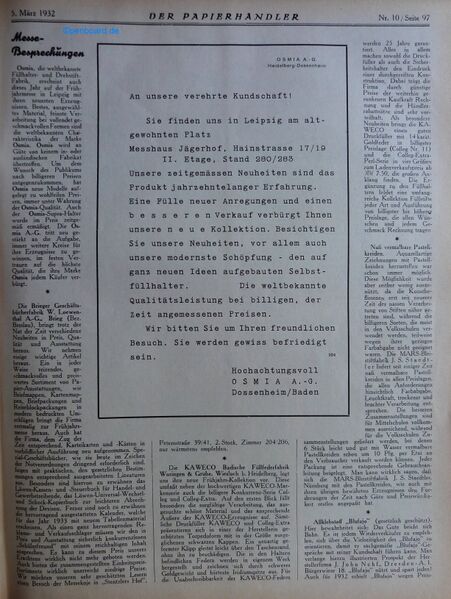 Scansione di una pubblicità datata 1932-03-05. Pubblicazione su: Der Papierhändler - Fachblatt Schreibwaren für Papier u. Büro-Bedarf, n. 10, pag. 97. Contributo di Tom Westerich, https://www.penboard.de. Data visibile direttamente. Pagina di pubblicità relativa ad una fiera (fra cui dei pastelli Staedtler) con tre articoli concernenti penne stilografiche: uno Kaweco che cita le serie Colleg e Colleg-Extra e due della Osmia, in cui viene citata la Osmia Supra.