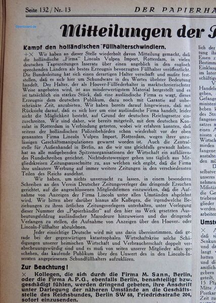 Scanning of an article dated 1932-03-26. Published on: Der Papierhändler - Fachblatt Schreibwaren für Papier u. Büro-Bedarf, n. 13, pag. 132. Dating established by the publication date of the volume from which the page is taken. Month and day from the magazine number. Corporate article against the marketing of Dutch Hoover pens in Germany described as junk. Interesting because it indicates as supplier of the same the "Lincoln Vulpen Import" of Rotterdam.