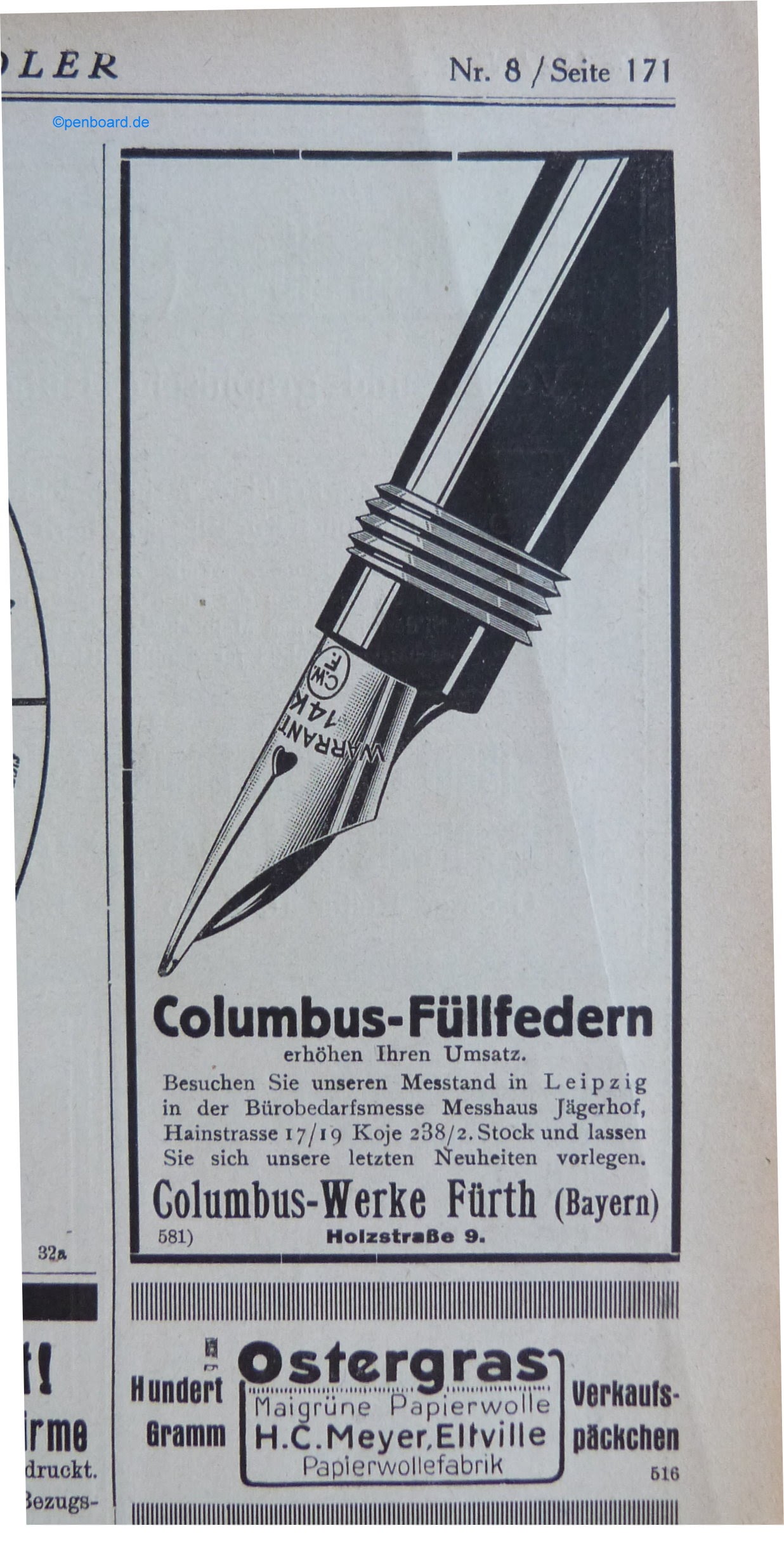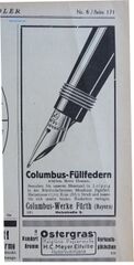 Scansione di una pubblicità datata 1925-02-21. Pubblicazione su: Der Papierhändler - Fachblatt Schreibwaren für Papier u. Büro-Bedarf, n. 9, pag. 171. Indica come indirizzo: "Furth (Bayern) Holzstrasse 9". Contributo di Tom Westerich, https://www.penboard.de. Data ottenuta da quella di pubblicazione del volume da cui la pagina è estratta. Mese e giorno determinati dal numero della rivista. Pubblicità per una rientrante Columbus-Werke. Cita l'azienda come "Columbus-Werke".