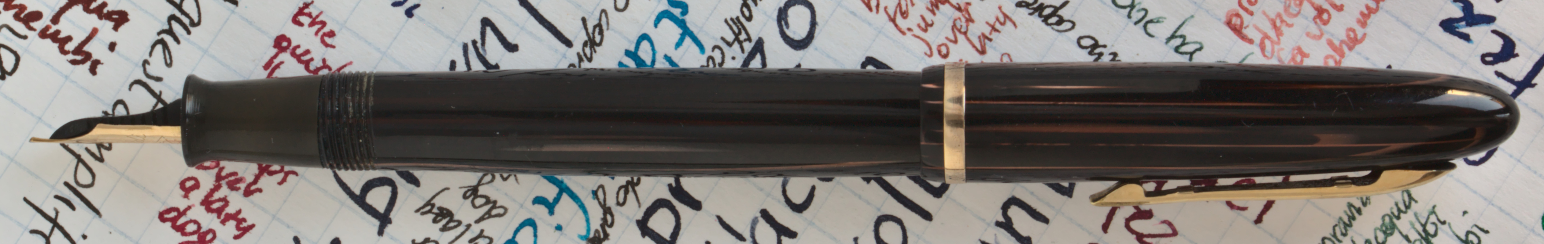 Foto di una penna Tibaldi. Modello: Tibaldi Lady. Caricamento a stantuffo. Realizzazione in celluloide arco rossa. Modello con pennino aperto, marcata "D-8393".