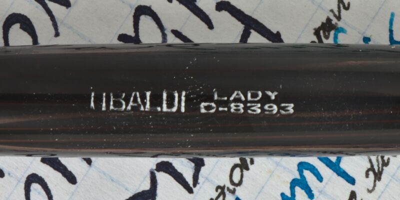 Photo of a pen produced by Tibaldi. Model: Tibaldi Lady. Filling system: piston filler. In arco red celluloid. Detail of inscription. Open nib model, marked "D-8393".