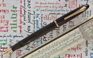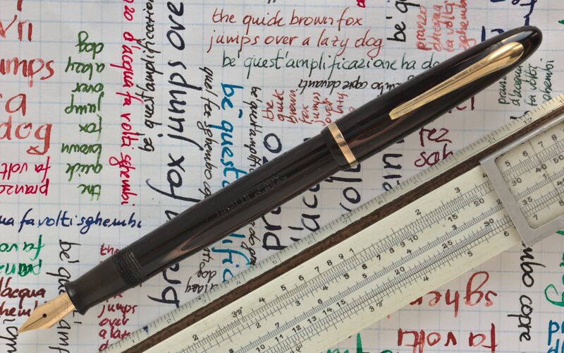 Foto di una penna Tibaldi. Modello: Tibaldi Lady. Caricamento a stantuffo. Realizzazione in celluloide arco rossa. Modello con pennino aperto, marcata "D-8393".
