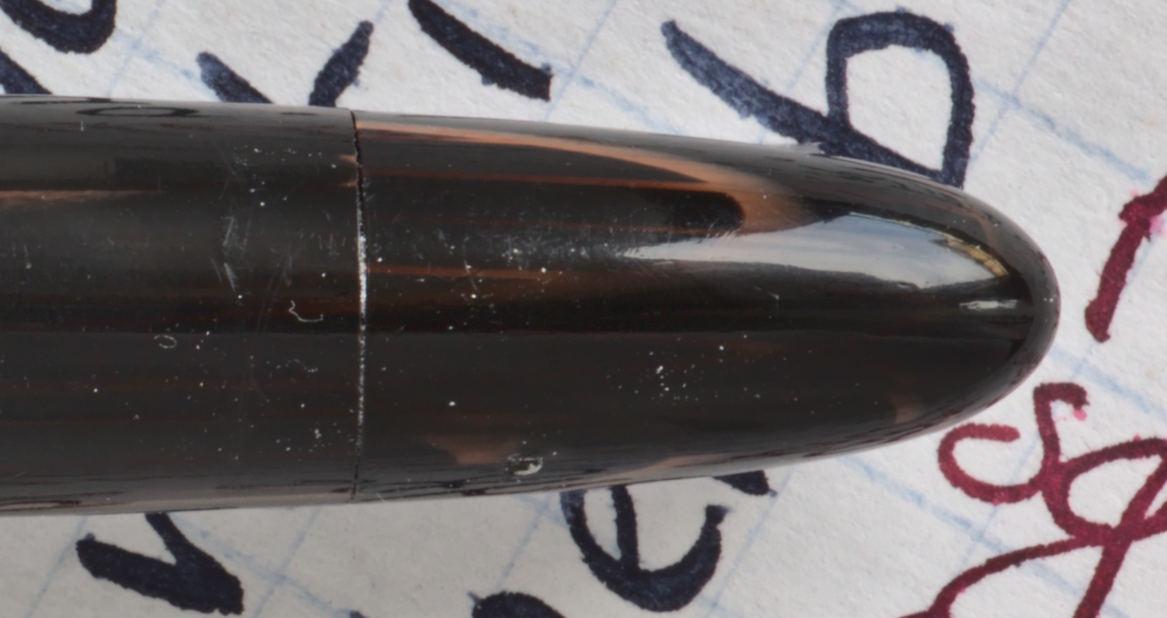 Foto di una penna Tibaldi. Modello: Tibaldi Lady. Caricamento a stantuffo. Realizzazione in celluloide arco rossa. Dettaglio del fondello. Modello con pennino aperto, marcata "D-8393".