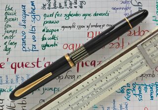 Foto di una penna Tibaldi. Modello: Tibaldi Trasp.M. Caricamento a stantuffo. Realizzazione in celluloide nera. Modello con pennino carenato, marcata "D-2333".