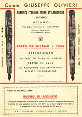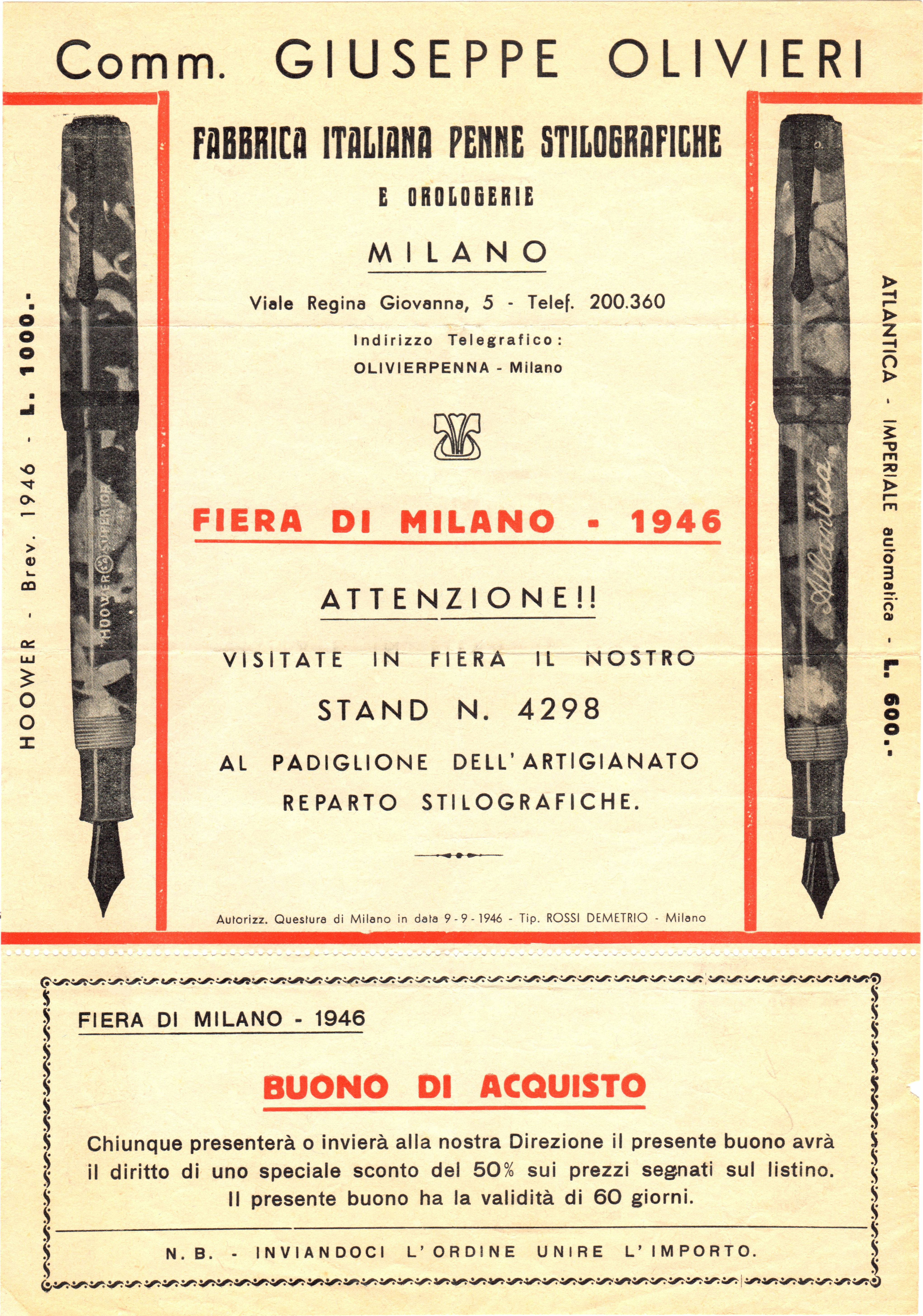Scanning of from Olivieri dated 1946-09-09. Date directly visible. Advertisement for attendance at the Milan Fair with discount voucher. It shows a Hoower Superior model and an Atlantica, also described as