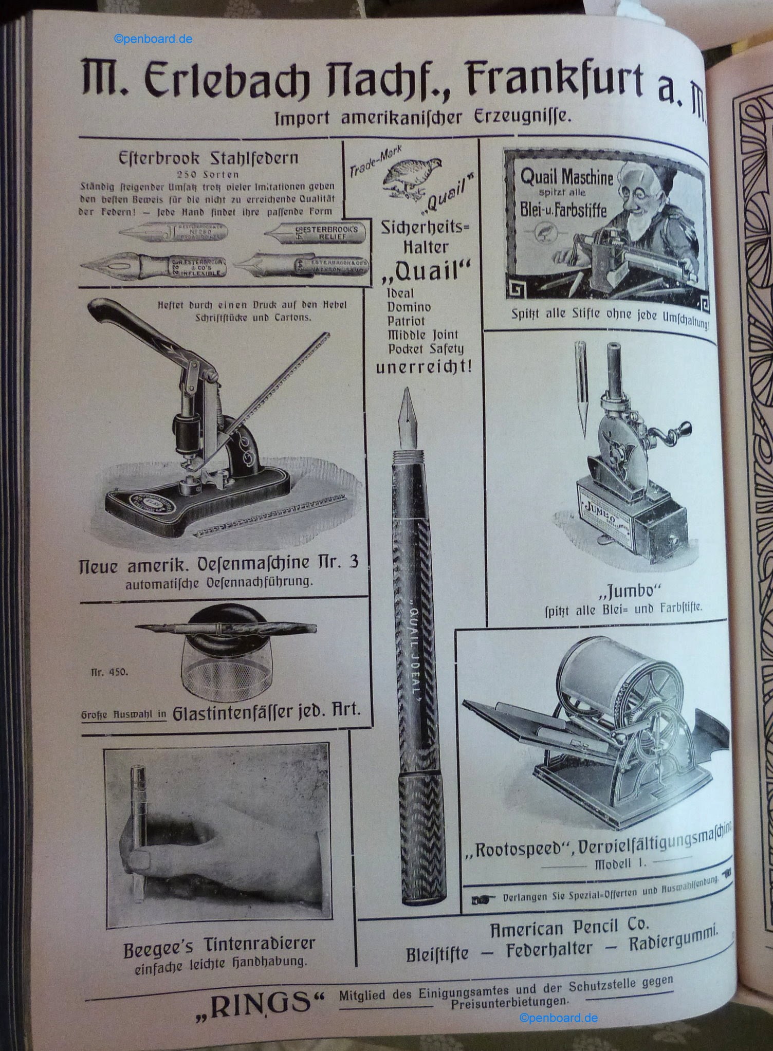 Scansione di una pubblicità Quail (un marchio della Erlebach) datata 1913-01-04. Pubblicazione su: Der Papierhändler - Fachblatt Schreibwaren für Papier u. Büro-Bedarf, n. 1. Contributo di Tom Westerich, https://www.penboard.de. Data ottenuta da quella di pubblicazione del volume da cui la pagina è estratta. Pubblicità della "M. Erlebach Nachf." per diversi articoli di cancelleria, fra cui dei pennini Esterbrook un temperamatite anch'esso a marchio Quail, ed il modello safety Quail Ideal.