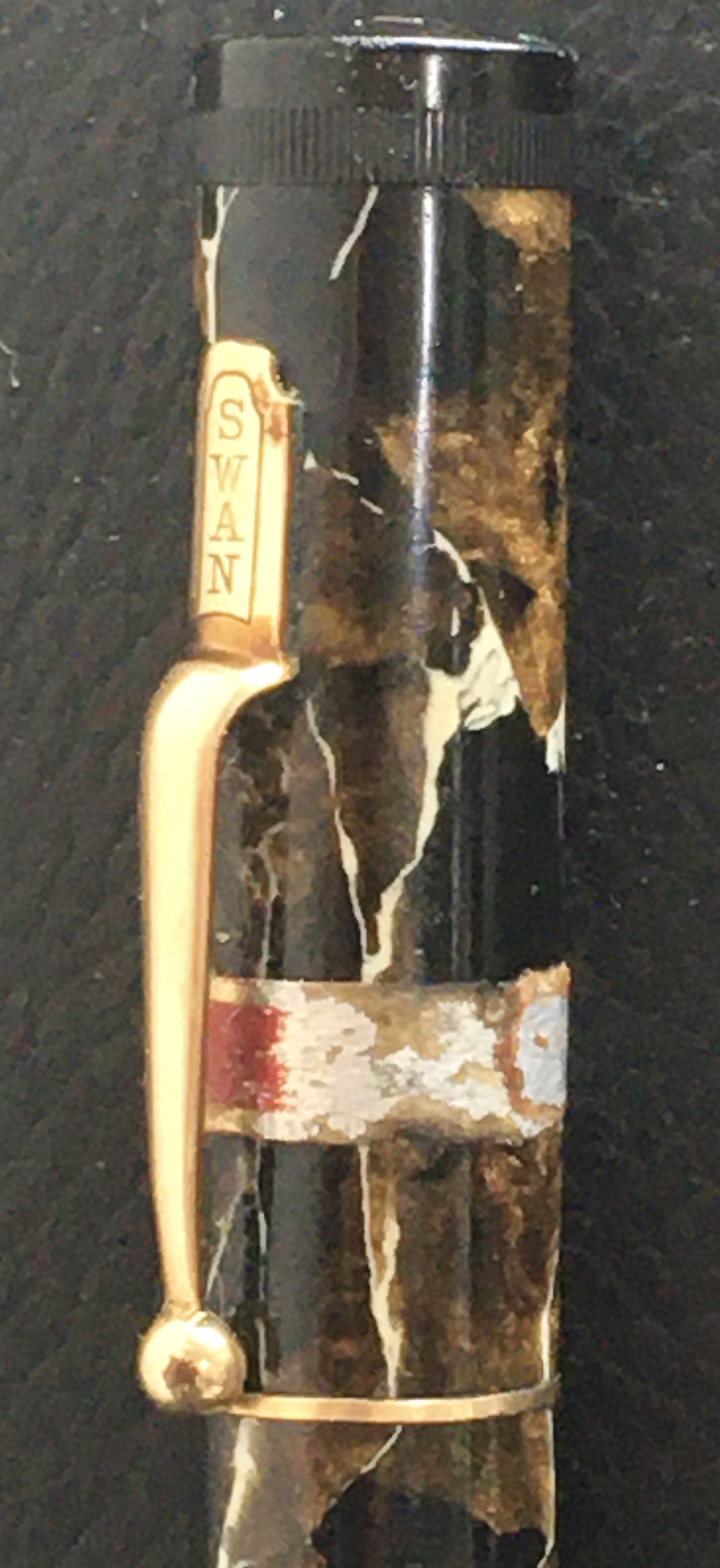 Photo of a pen produced by Swan. Model: Swan L 205. Filling system: "Leverless". In black/brown cream veined calluloide. Detail of cap. Model marked L205/47. With the patent nº GB-390585 imprint in the barrel.