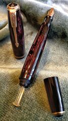 Foto di una penna Parker. Modello: Vacumatic Shadow Wave. Caricamento vacumatic. Realizzazione in celluloide a righe rosse. Versione Senior. Contributo di Gustavo, (utente forum gfrico2000).
