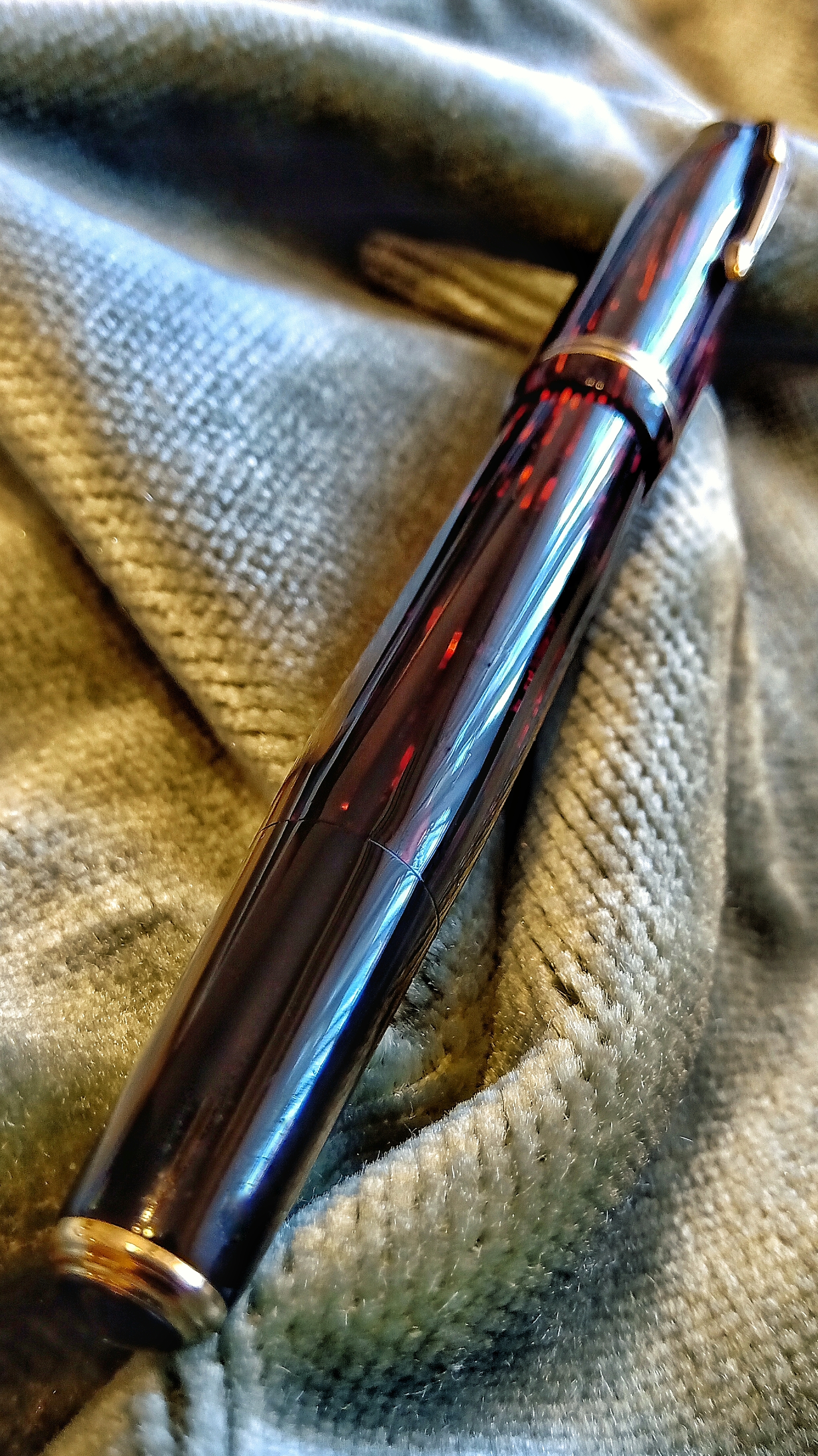 Foto di una penna Parker. Modello: Vacumatic Shadow Wave. Caricamento vacumatic. Realizzazione in celluloide a righe rosse. Versione Senior. Contributo di Gustavo, (utente forum gfrico2000).
