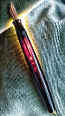 Foto di una penna Parker. Modello: Vacumatic Shadow Wave. Caricamento vacumatic. Realizzazione in celluloide a righe rosse. Versione Senior. Contributo di Gustavo, (utente forum gfrico2000).