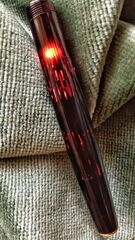 Foto di una penna Parker. Modello: Vacumatic Shadow Wave. Caricamento vacumatic. Realizzazione in celluloide a righe rosse. Versione Senior. Contributo di Gustavo, (utente forum gfrico2000).