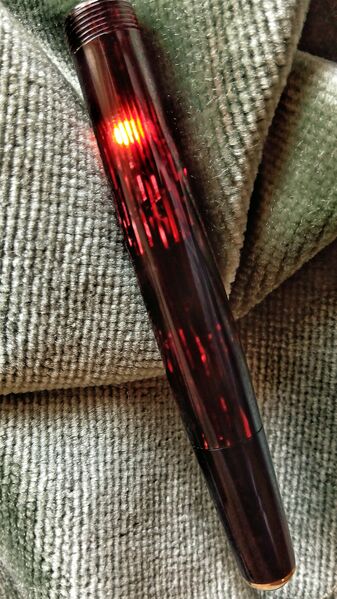 Photo of a pen produced by Parker. Model: Vacumatic Shadow Wave. Filling system: vacumatic filler. In red lined celluloid. Senior version.
