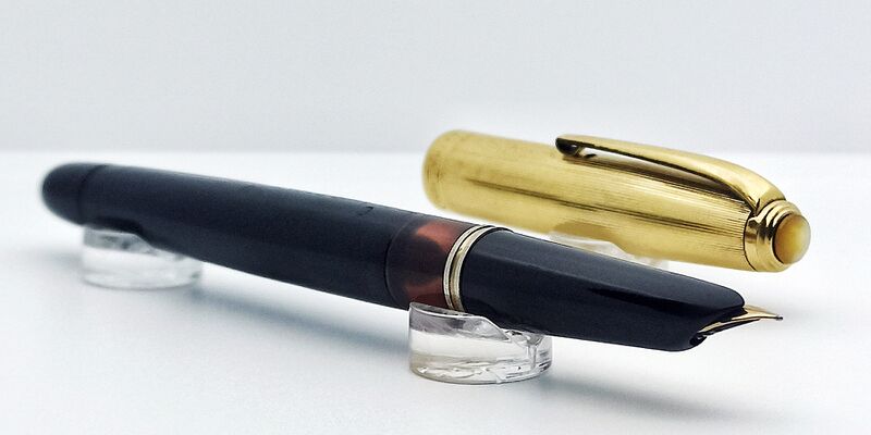 Photo of a pen produced by Columbus. Model: Columbus Extra 140. Filling system: push-knob. In black plastic resin. Hooded nib model with laminated cap, with transparent body section for ink level view.