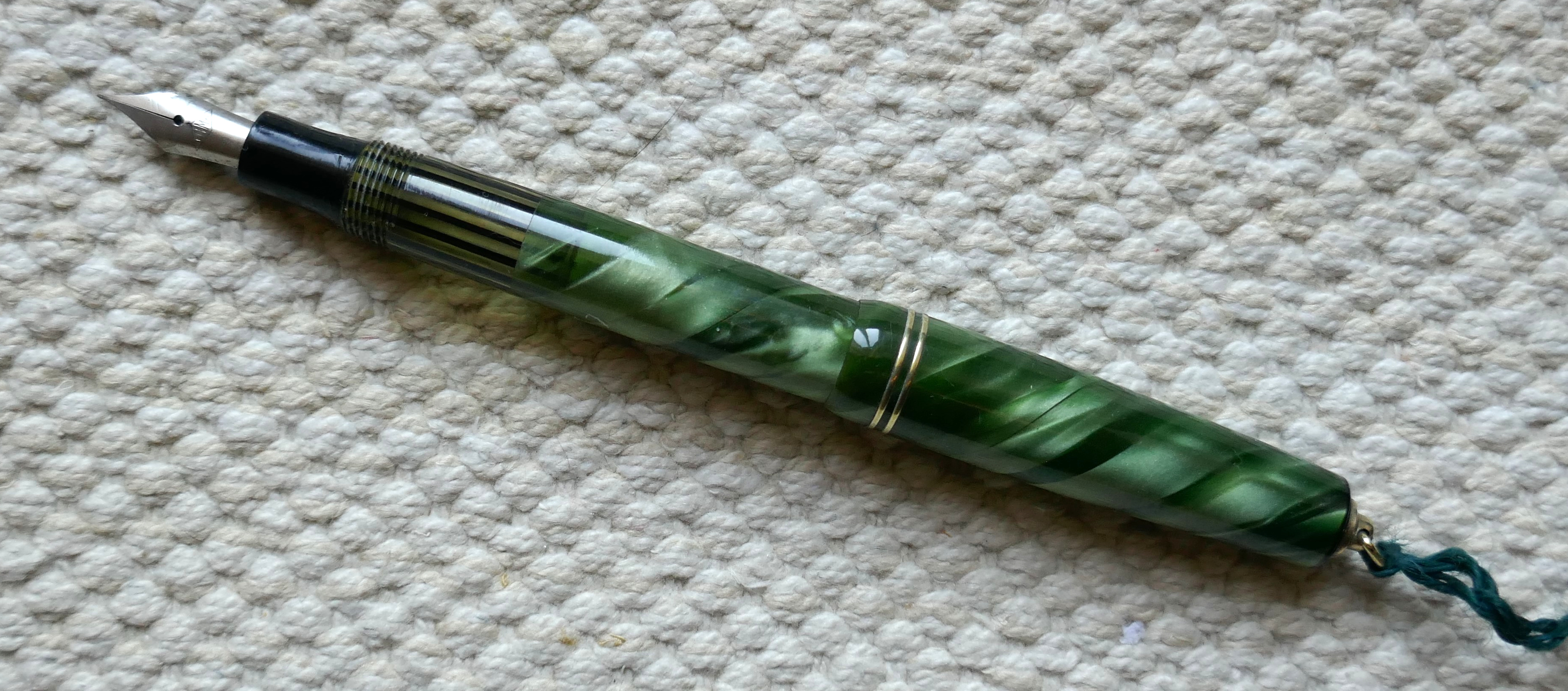 Foto di una penna Liset. Caricamento a stantuffo. Realizzazione in celluloide variegata verde. Modello ignoto, da signora, pennino in acciaio marcato "LUMA". Contributo di Andrea (utente forum bisguillo).