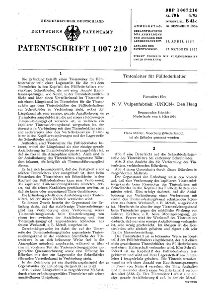 | attuale | 20:03, 11 ott 2021 | 1 296 × 1 754, 3 pagine (215 KB) | Piccardi (discussione | contributi) | {{PatentInfo |Inventor=Hans Müller |Assignee=N. V. Vulpenfabriek »Union« |Country=DE |ApplicationNum=1007210 |ApplicationDate=1954-12-18 |PatentNum=1007210 |PatentDate=1957-04-25 |PriorityDate=1954-03-04 |Titolo=Tintenleiter für Füllfederhalter |... |