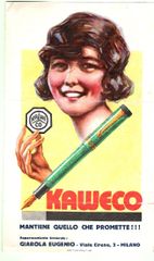<multilang> @it|Scansione di una pubblicità degli anni '30 di un rivenditore italiano della Kaweco, fornita da Giovanni Scrivere e pubblicata con il permesso dell'autore. Stessa immagina compare sulla copertina su un catalogo del 1930. @en|Scanning of a '30s Kaweco italian reseller advertising. By Giovanni Scrivere, published with his permission. Same image on the cover of a 1930 catalog. </multilang>