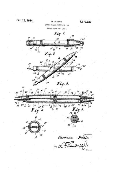 attuale22:26, 26 set 2012Miniatura della versione delle 22:26, 26 set 20121 159 × 1 704, 3 pagine (133 KB)Piccardi (discussione | contributi){{PatentInfo |Inventor=Herman Pohle |Assignee=Herman Pohle |Country=US |ApplicationNum=732900 |ApplicationDate=1934-06-28 |PatentNum=1977527 |PatentDate=1934-10-16 |PriorityDate=1934-06-28 |Titolo=Four color fountain pen |Marca=Unbranded |Descrizione=P...
