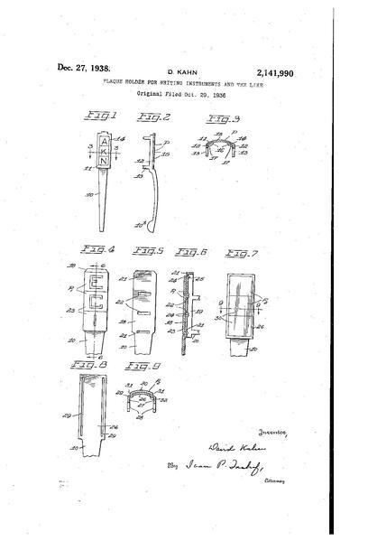 attuale23:07, 8 ago 2013Miniatura della versione delle 23:07, 8 ago 20131 159 × 1 704, 3 pagine (148 KB)Piccardi (discussione | contributi){{PatentInfo |Inventor=David Kahn |Assignee=David Kahn Inc |Country=US |ApplicationNum=167292 |ApplicationDate=1937-10-04 |PatentNum=2141990 |PatentDate=1938-12-27 |PriorityDate=1937-10-04 |Titolo=Plaque holder for writing instruments and the like |Mar...