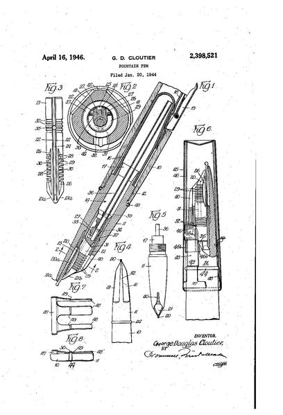 | attuale | 01:44, 8 lug 2012 | 1 159 × 1 704, 7 pagine (497 KB) | Piccardi (discussione | contributi) | {{PatentInfo |Inventor=George D. Cloutier |Assignee=Eversharp Inc. |Country=US |ApplicationNum=169130 |ApplicationDate=1944-01-20 |PatentNum=2398521 |PatentDate=1946-04-16 |PriorityDate=1944-01-20 |Titolo=Fountain pen |Marca=Eversharp |Modello=Fifth Av... |