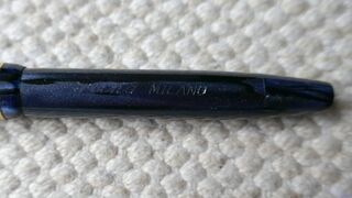 Photo of a pen produced by Silpa. Filling system: button filler. In striated blue celluloid. Detail of inscription. Unknown model.