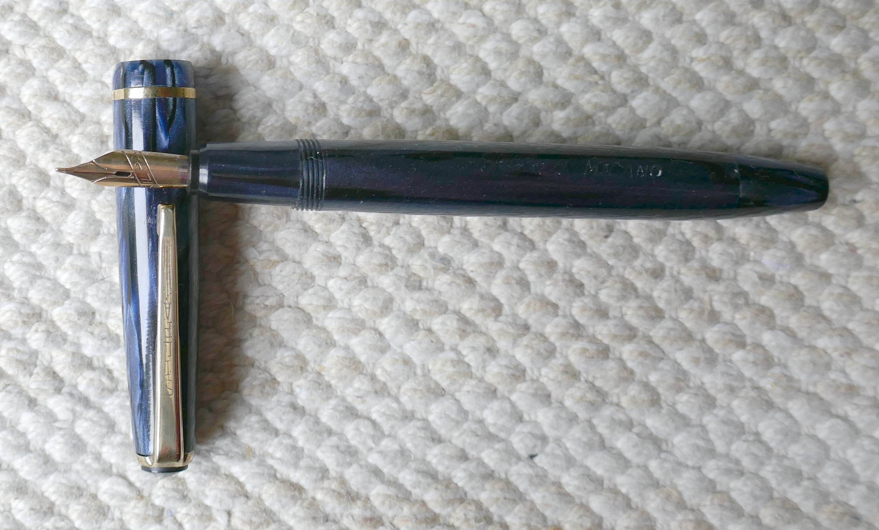 Photo of a pen produced by Silpa. Filling system: button filler. In striated blue celluloid. Unknown model.