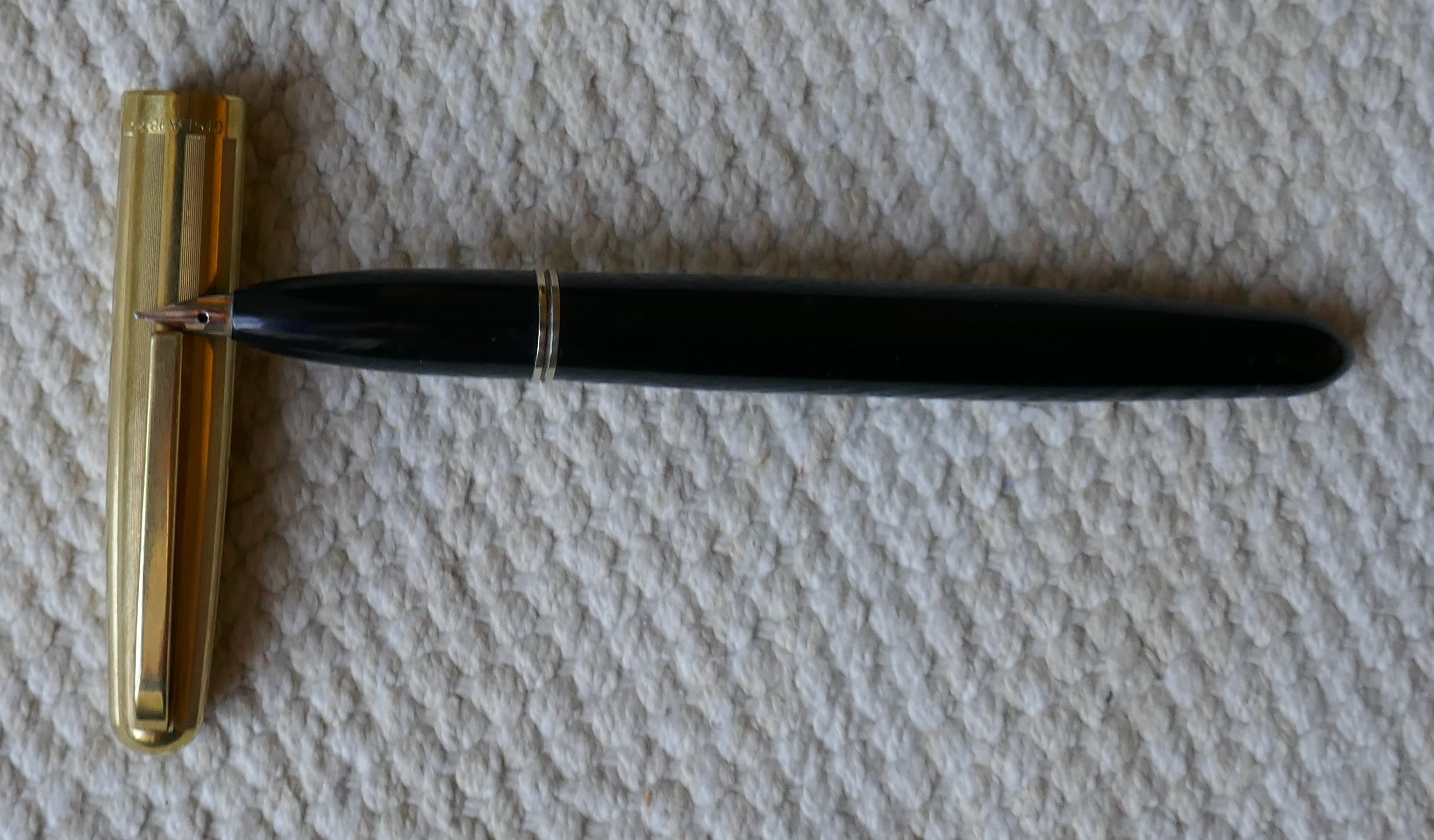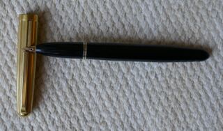 Photo of a pen produced by CISEA. Model: Cisea 48. Filling system: lever filler. In black celluloid. Half hooded nib model, with rolled gold cap.