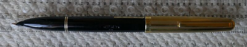 Foto di una penna CISEA. Modello: Cisea 48. Caricamento a levetta. Realizzazione in celluloide nera. Modello a pennino semi-coperto, con cappuccio laminato. Contributo di Andrea (utente forum bisguillo).