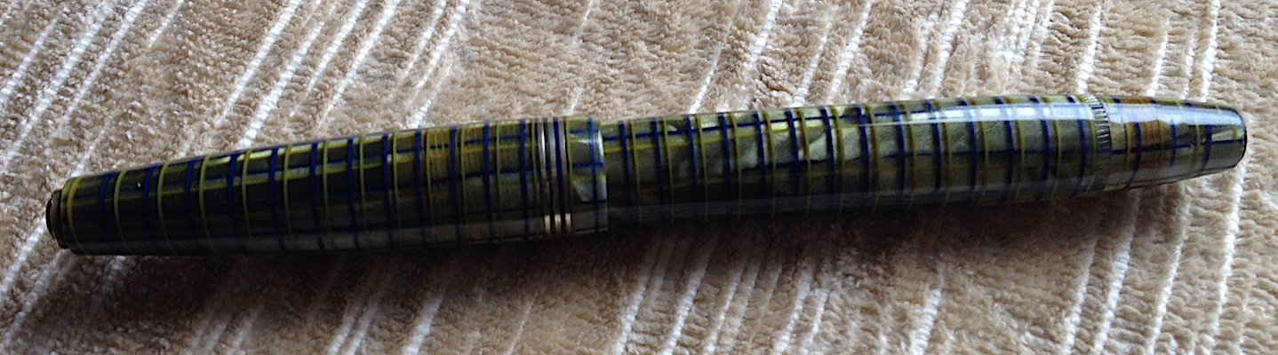 Photo of a pen produced by Alfa-Ro (a Roccati trademark). Filling system: button filler. In transparent crossing lines celluloid. Unknown model.