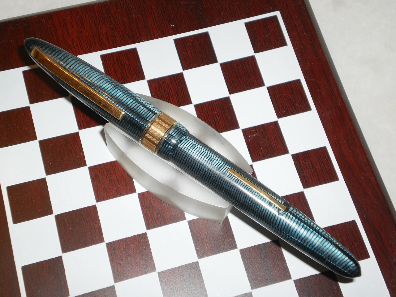 Photo of a pen produced by Auletto. Filling system: lever filler. In horizontal blue striped celluloid. Unknown model.