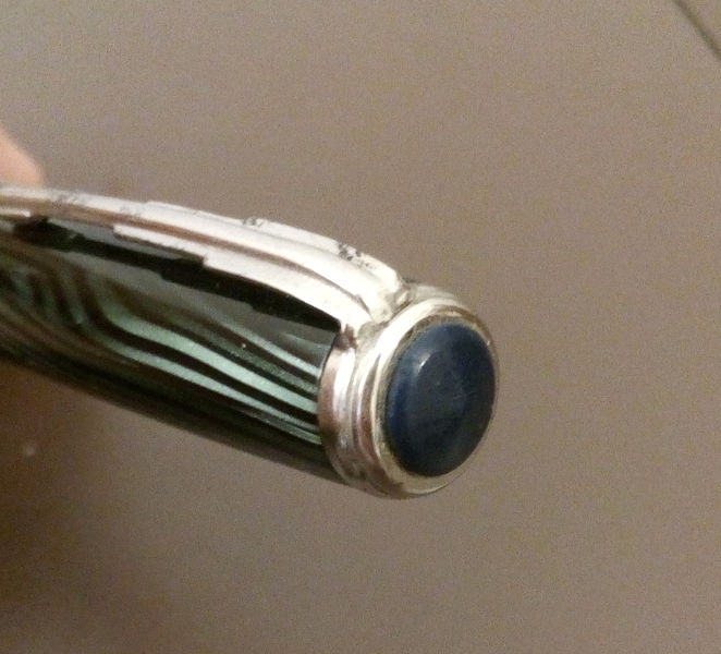 Photo of a pen produced by Atena. Filling system: button filler. In striped green celluloid. Detail of cap head. Unknown model, scaled clip identical to the one of some pen of the Summit Serie S.