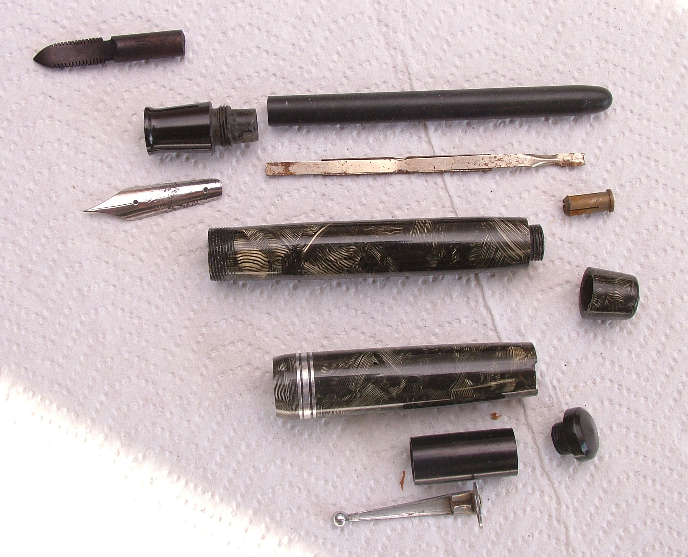 Foto di una penna Aurora. Modello: Selene. Caricamento a pulsante di fondo. Realizzazione in celluloide grigia a striscioline sottili. Dettaglio del caricamento. Prima serie. Esploso delle parti della penna. Contributo di Massimo (utente forum maxpop55).