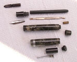 Photo of a pen produced by Aurora. Model: Selene. Filling system: button filler. In short gray strip (webbed) celluloid. Detail of filling system. First version. Exploded of pen parts.