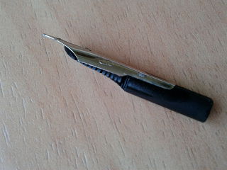 Foto di una penna Aurora. Modello: Selene. Caricamento a stantuffo. Realizzazione in celluloide nera. Dettaglio del pennino. Dettaglio dell'alimentatore. Terza serie. Contributo di Giorgio (utente forum Musicus).